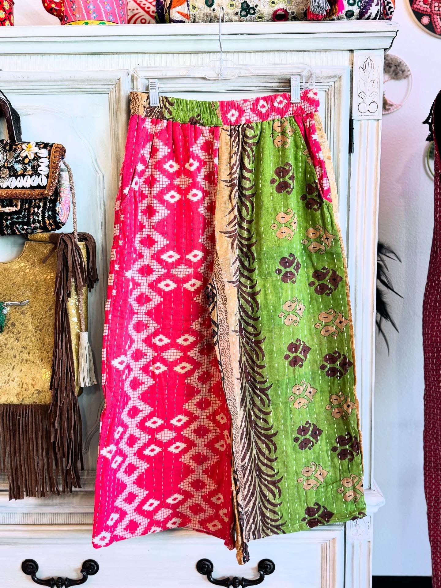 Pink & Olive Bloom – Handmade Kantha Cotton Pants | Wide Leg Boho Trousers