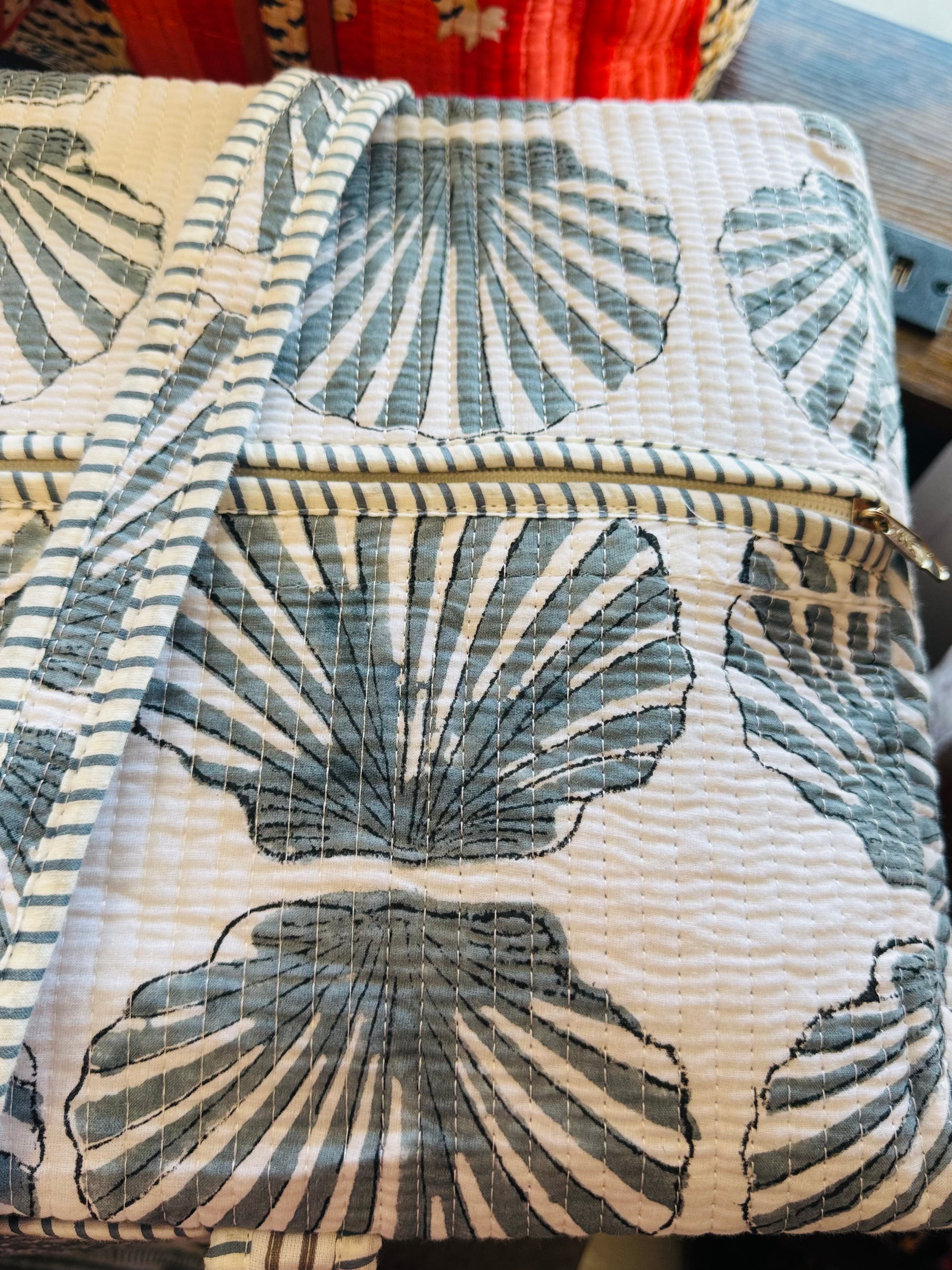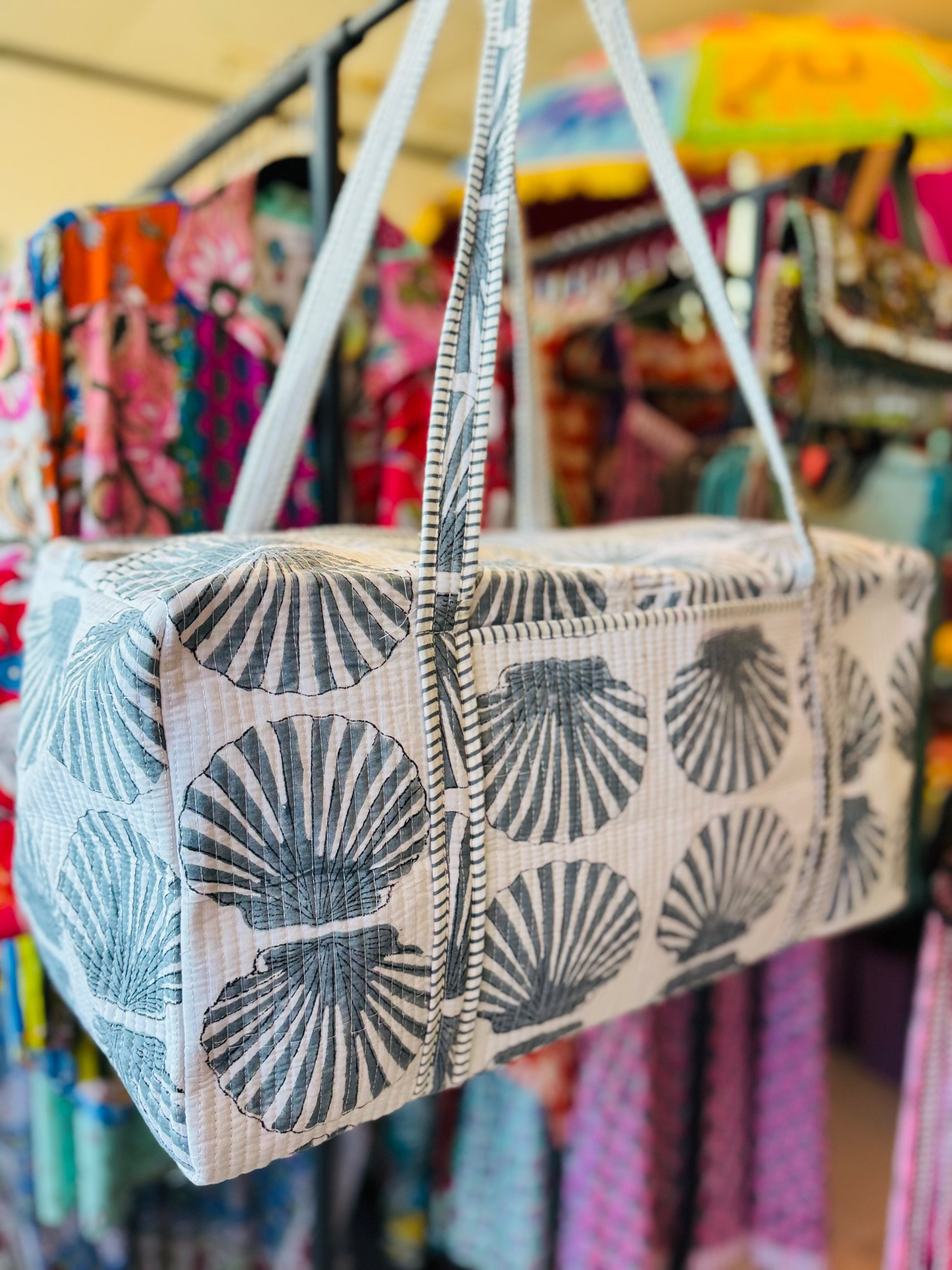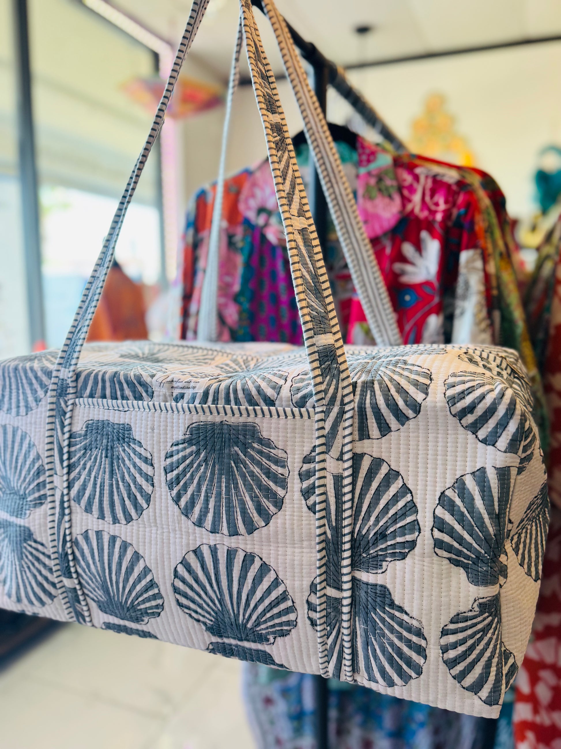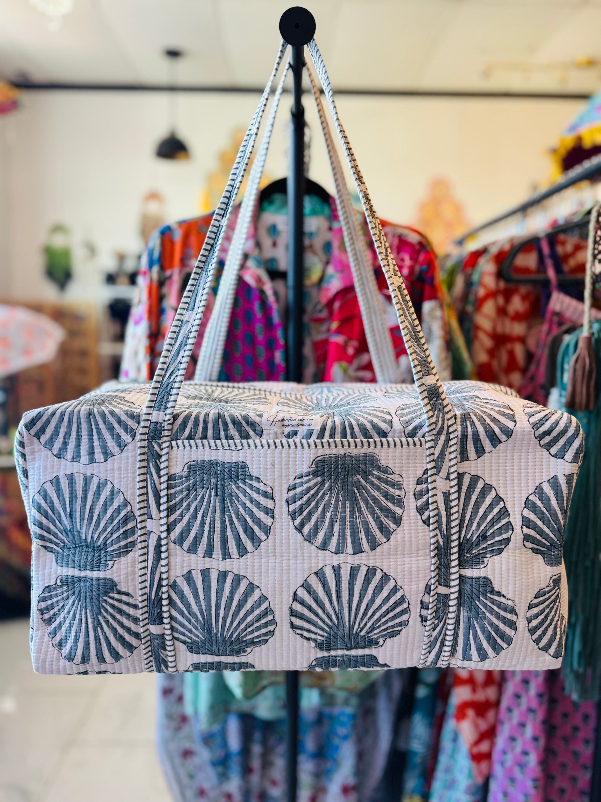 This charming quilted duffel bag - featuring delicate grey shell motifs on a crisp white background is perfect for weekend getaways, gym trips, beach goings or everyday use.