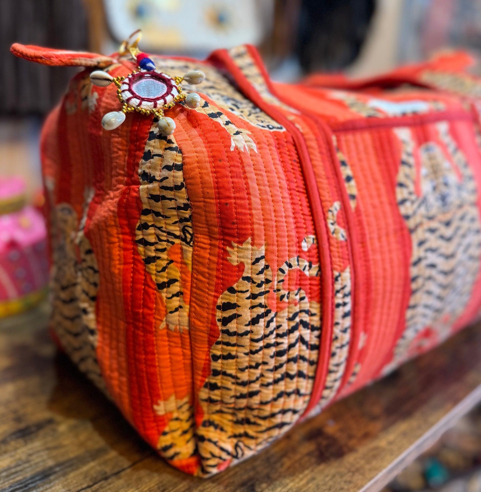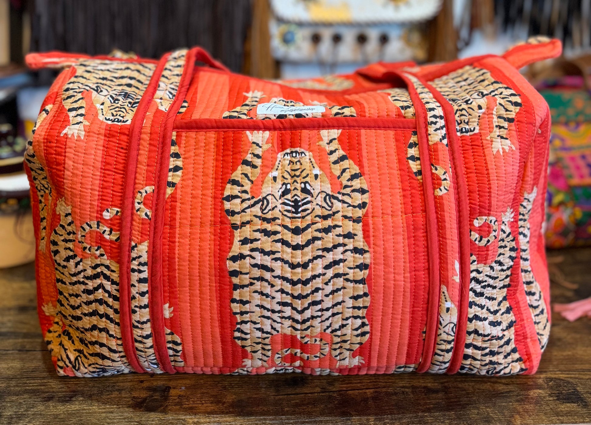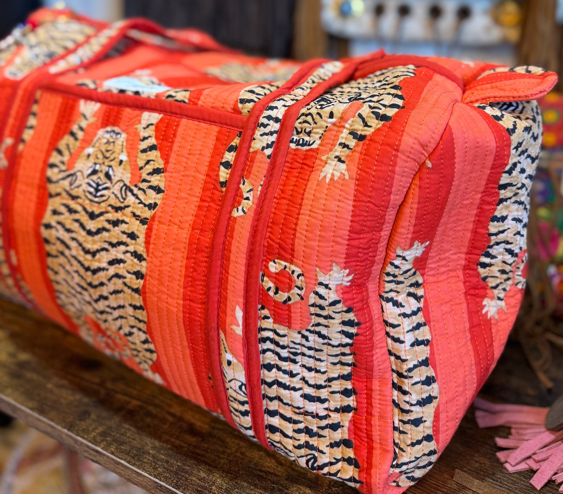 This handmade quilted duffel bag features a striking tiger block print on vibrant orange cotton, blending artisan craftsmanship with everyday functionality. Spacious enough for all your essentials yet lightweight to carry, this bag is designed to travel beautifully wherever you go.