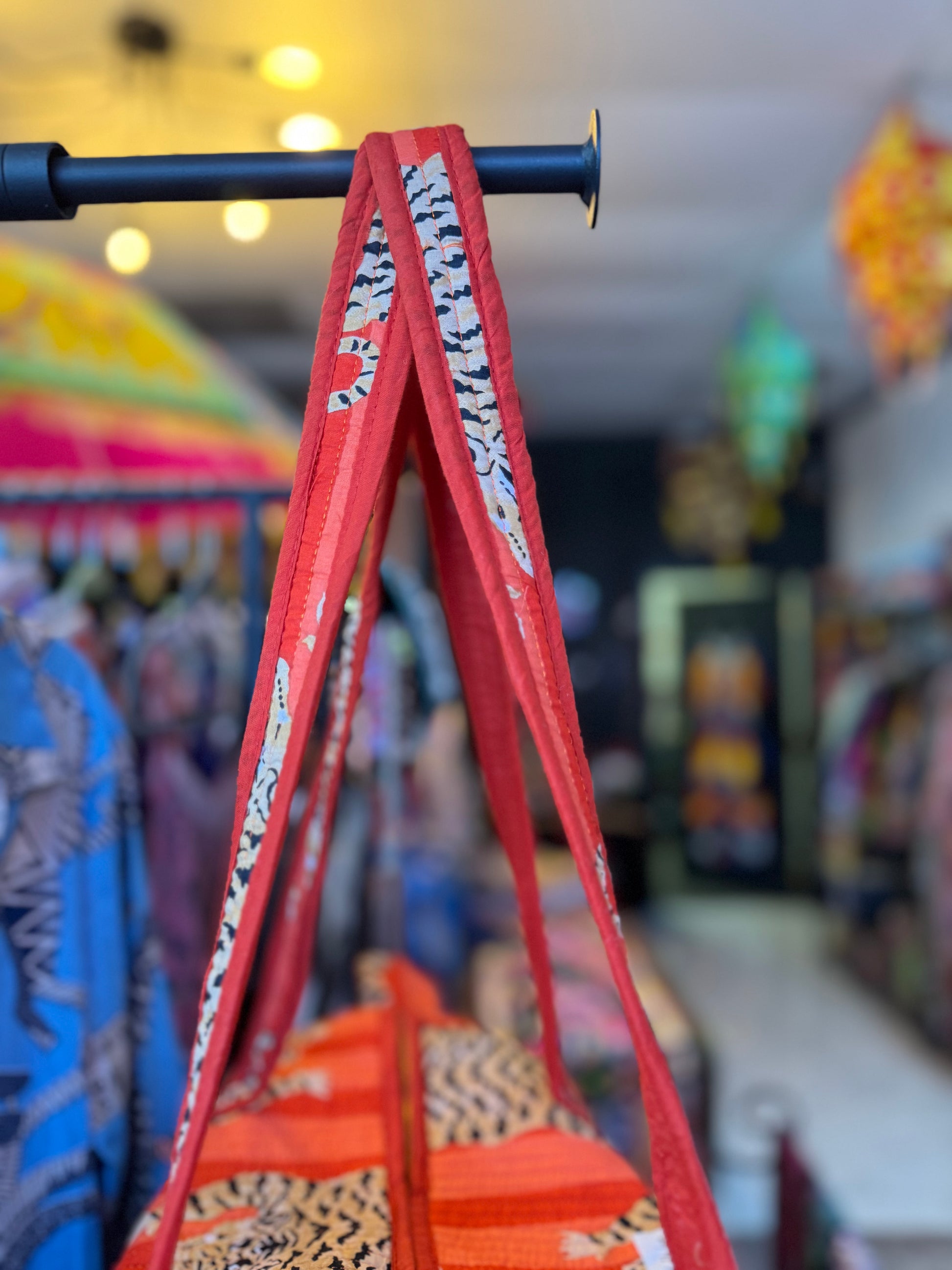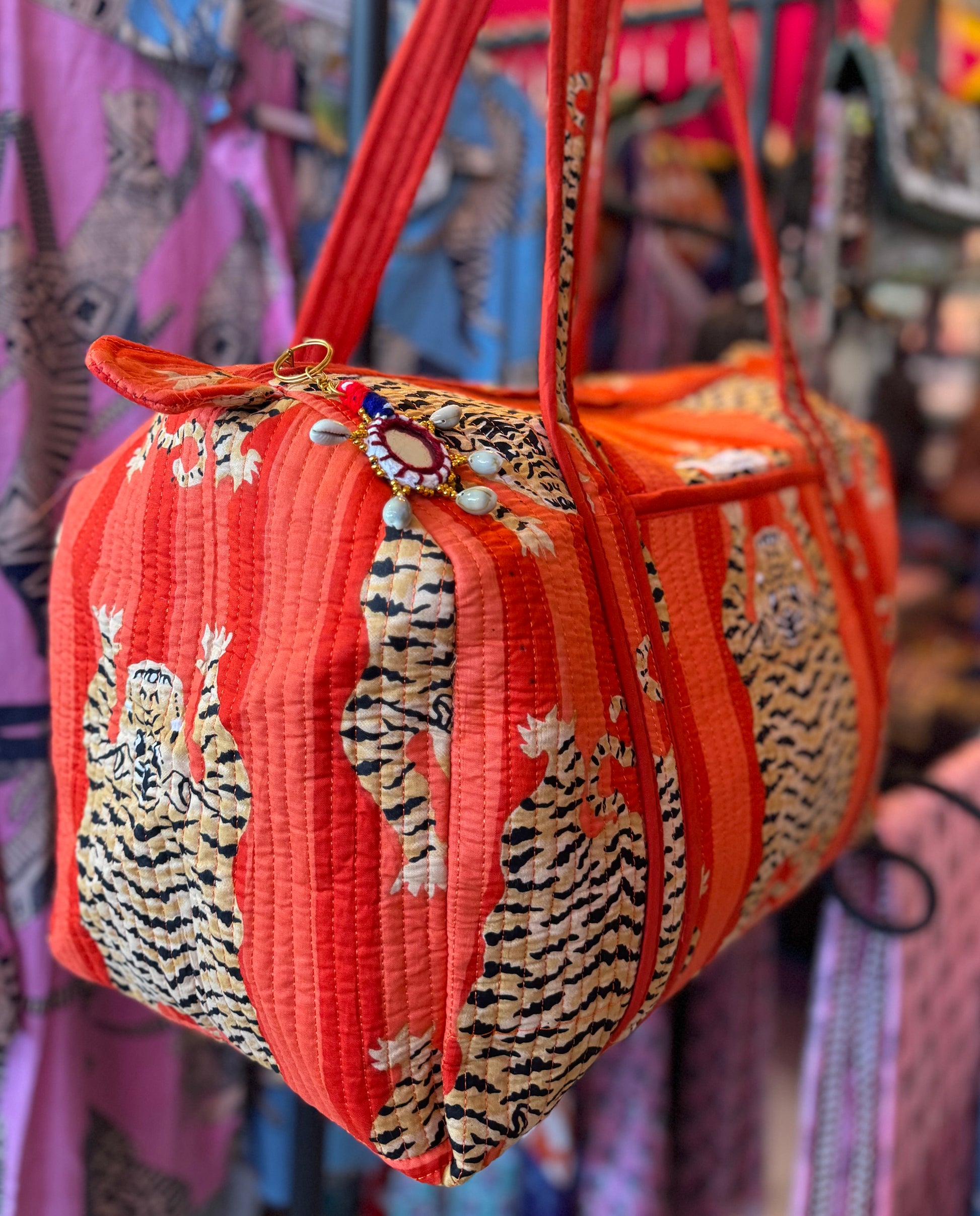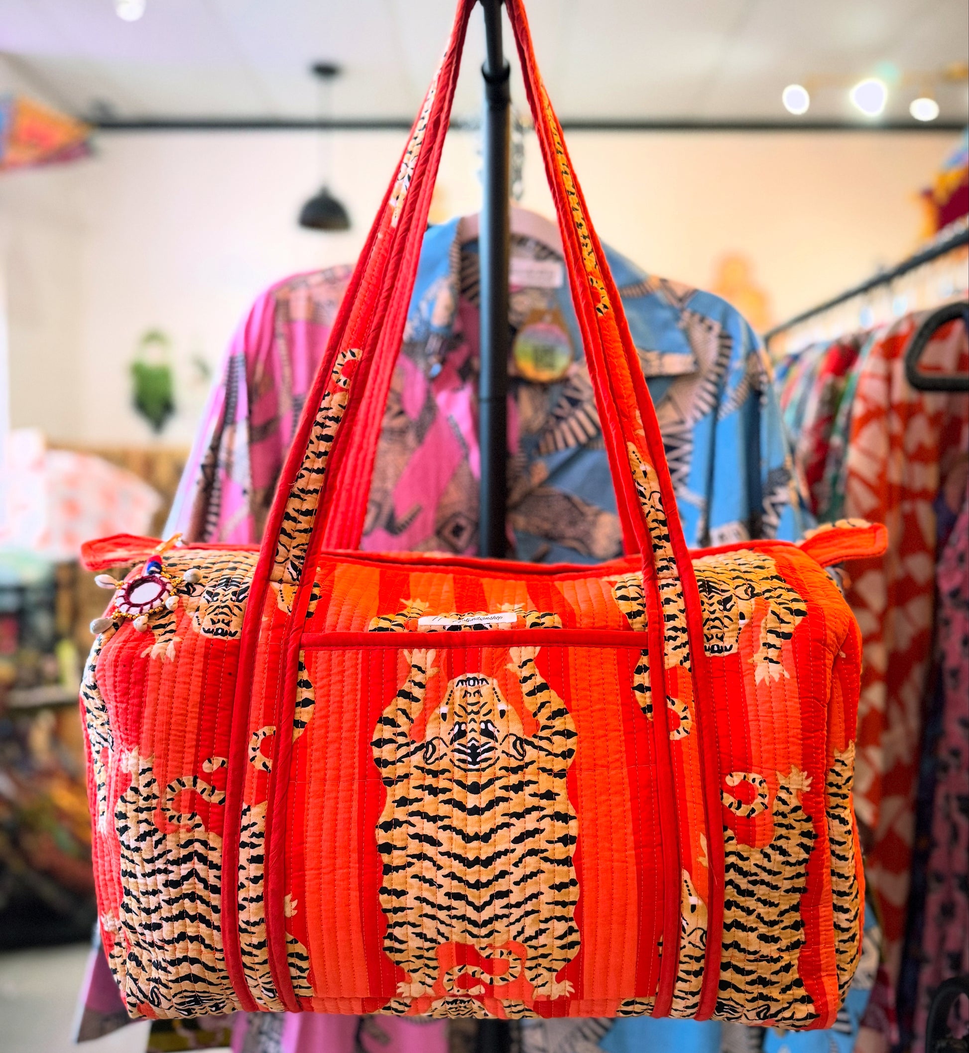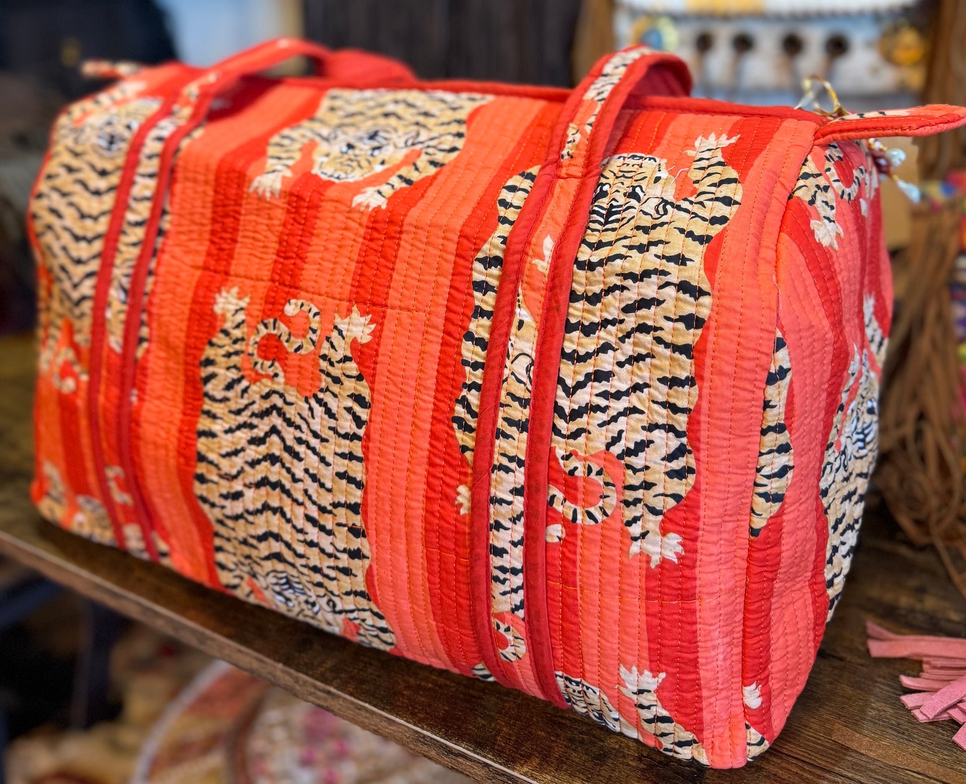 This handmade quilted duffel bag features a striking tiger block print on vibrant orange cotton, blending artisan craftsmanship with everyday functionality. Spacious enough for all your essentials yet lightweight to carry, this bag is designed to travel beautifully wherever you go.