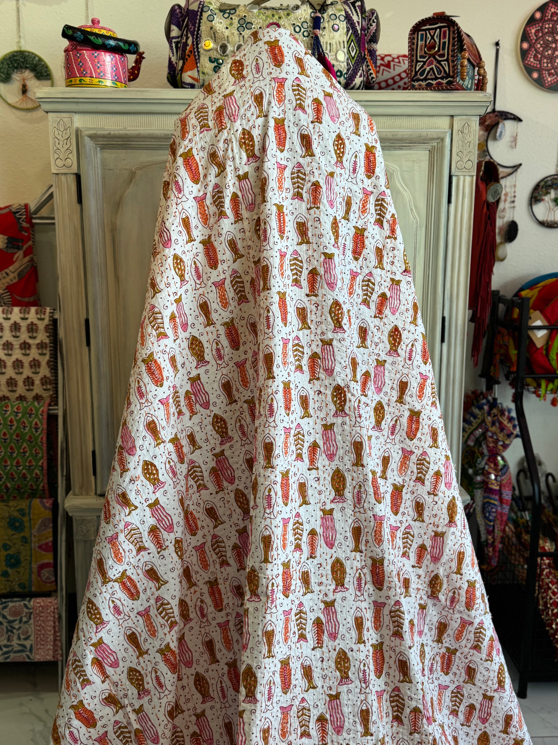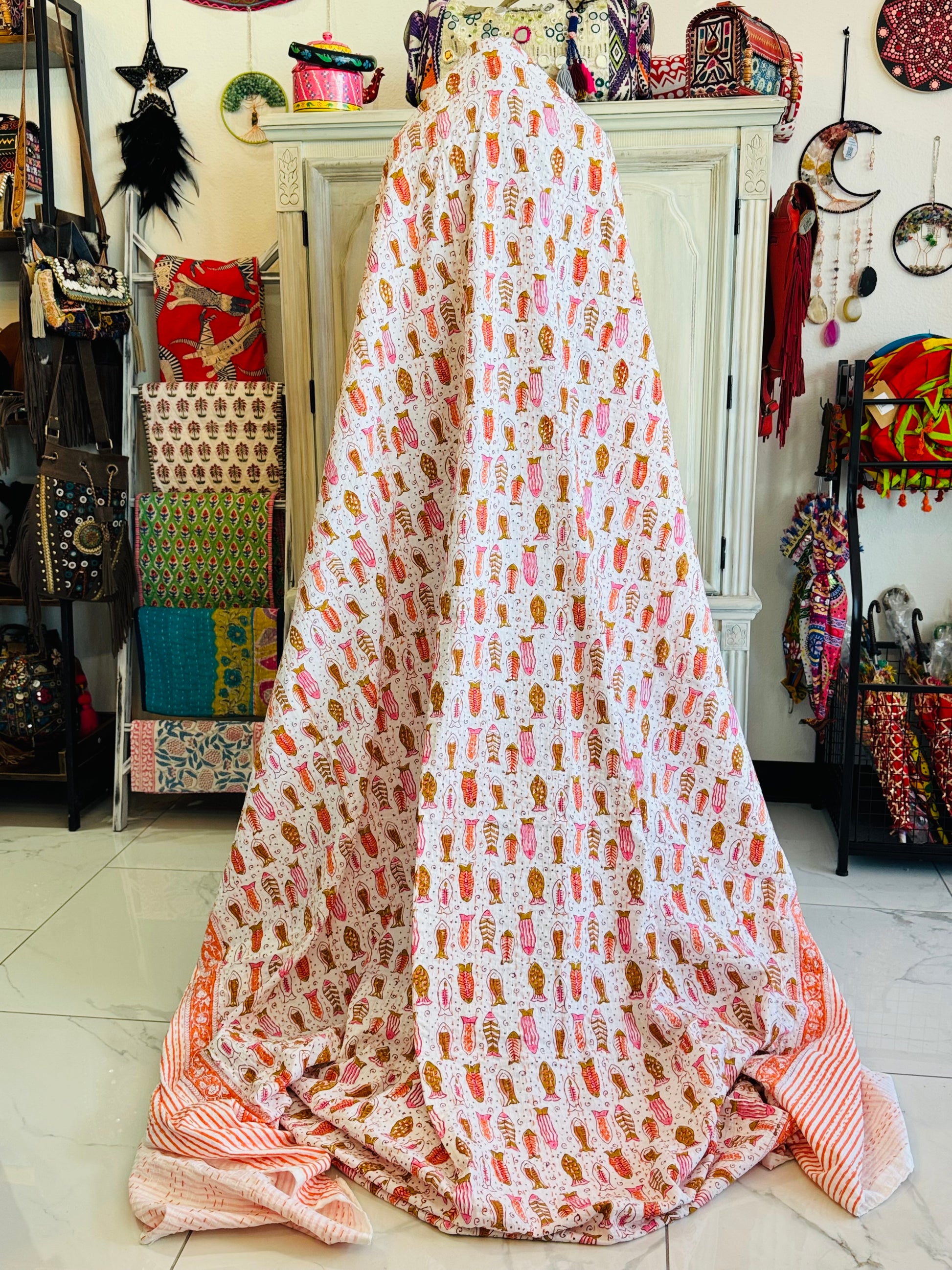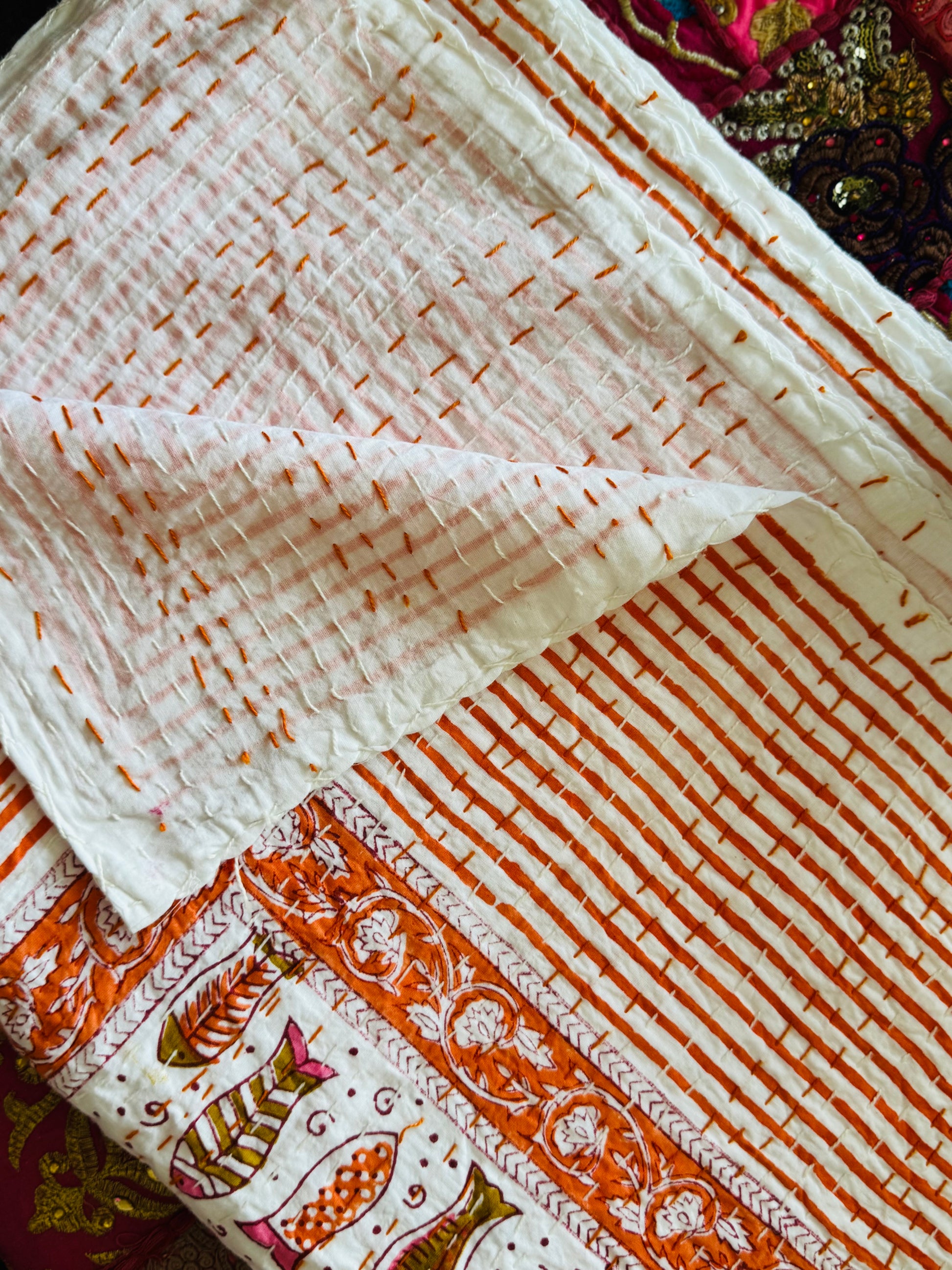 Dive into color with Rainbow Reef, a one-of-a-kind Kantha quilt featuring hand block-printed multicolored fish on a white background, finished with a vibrant orange border. The reverse side is solid white — clean, simple, and perfect for any setting.