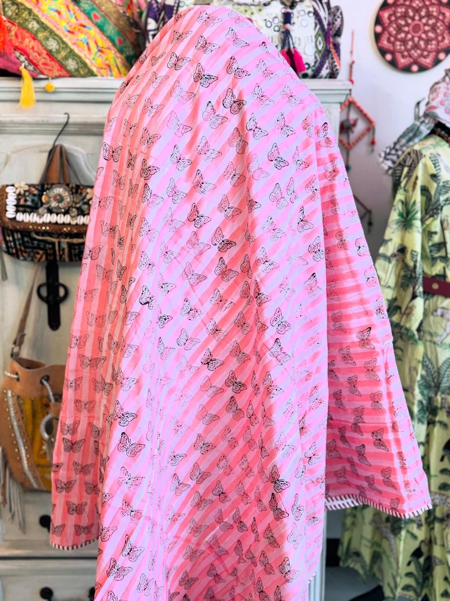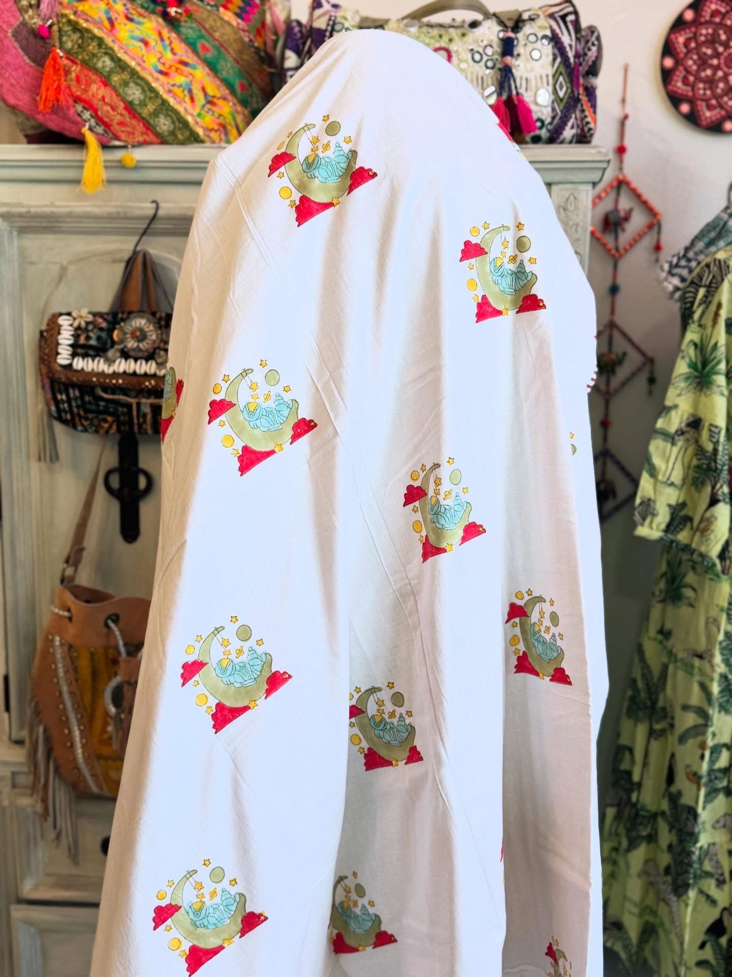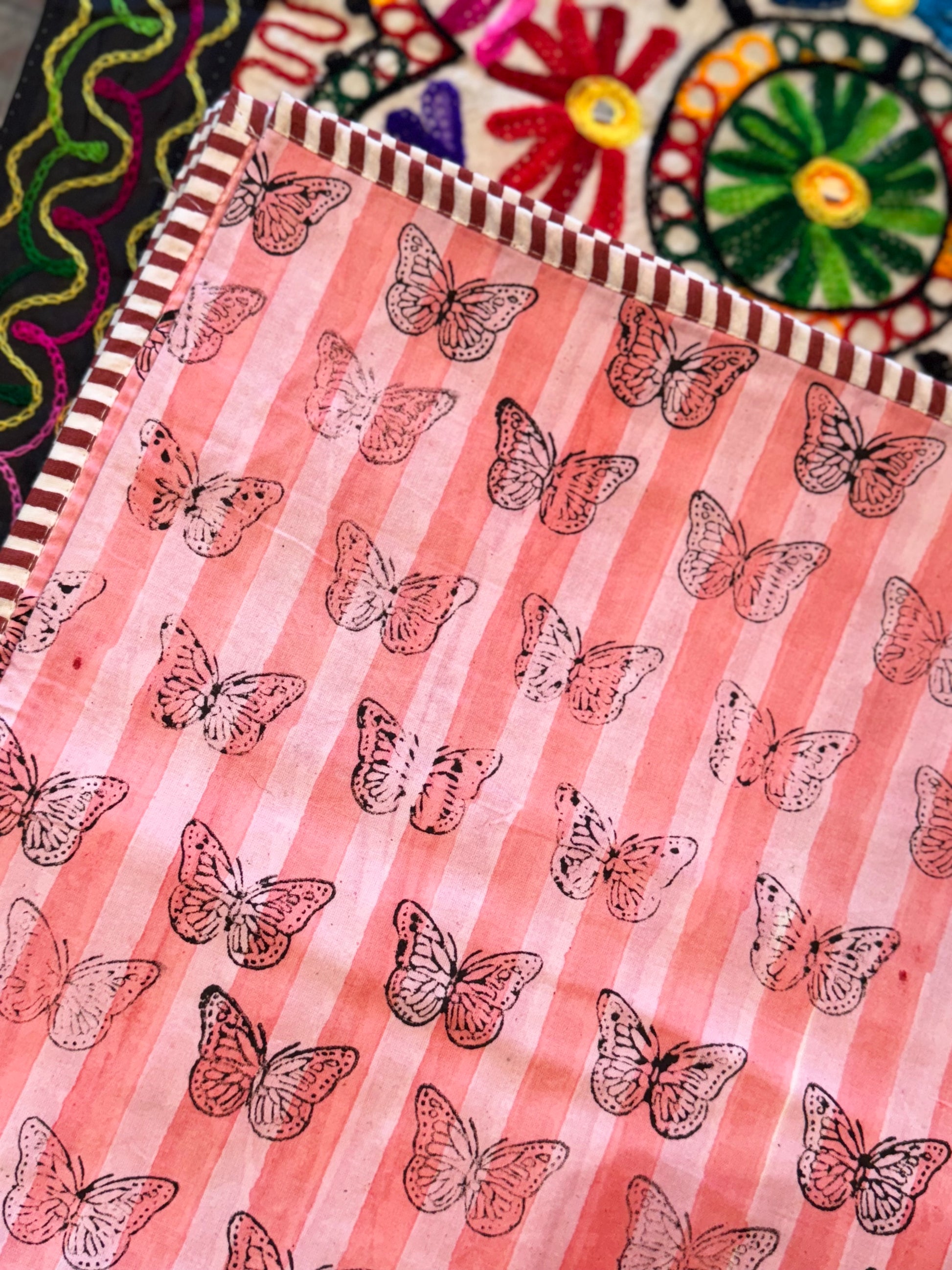 Wrap your toddler in comfort with our reversible cotton dohar, featuring astronauts on one side and butterflies on the other. Handmade from 100% cotton and handblock printed, this ~60 x 50 inch blanket has no stuffing or batting, making it lightweight, breathable, and perfect for year‑round naps.