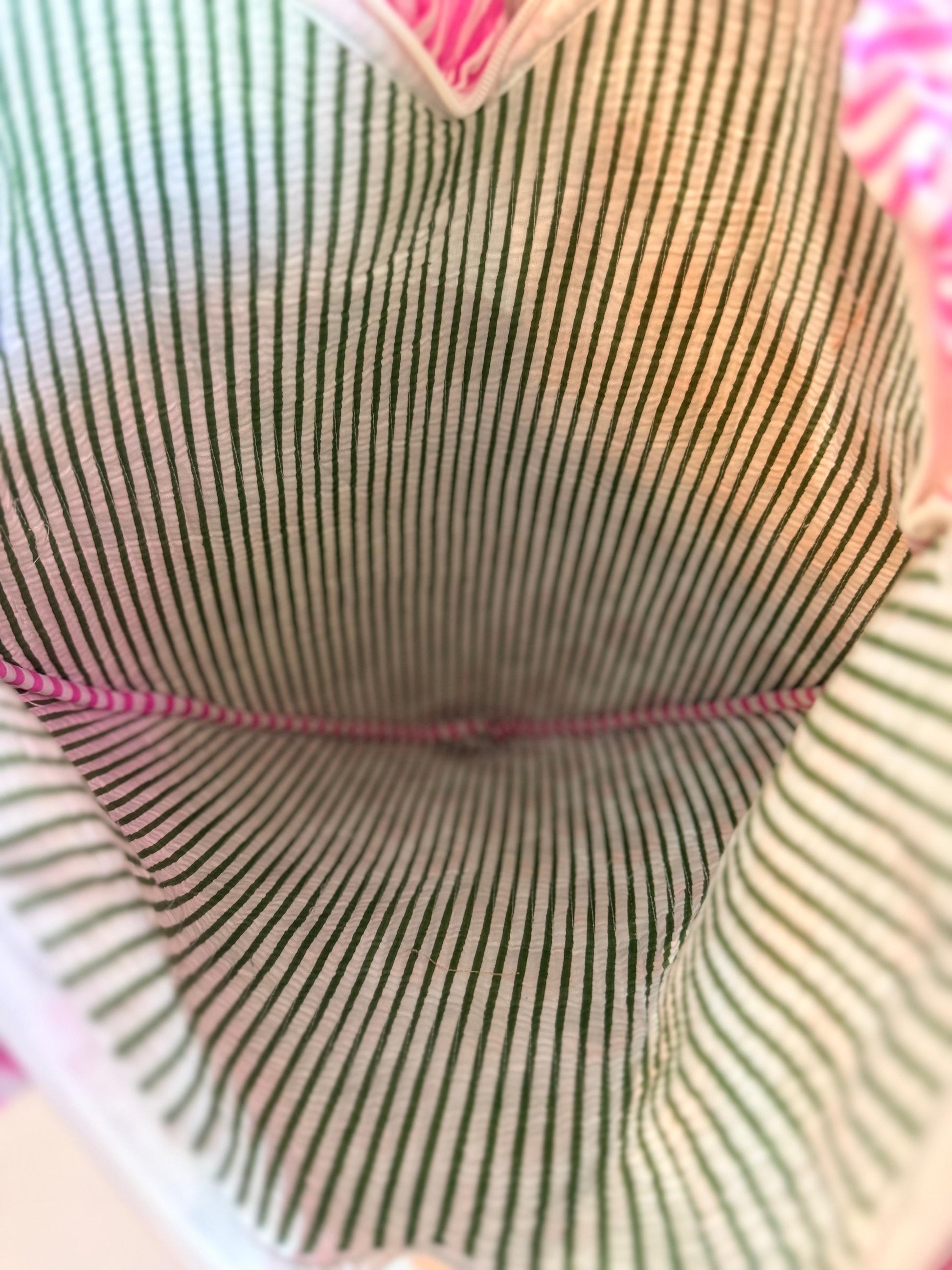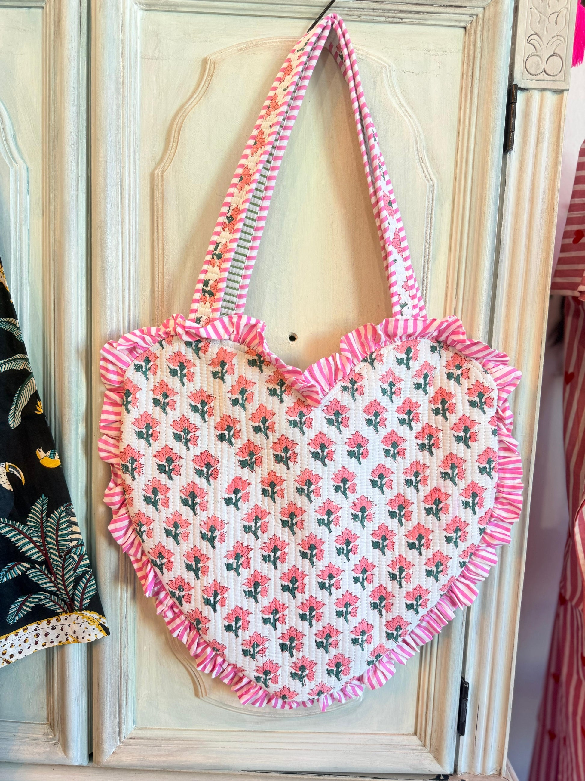 Hand-quilted from white cotton with soft pink and green floral accents, this tote is trimmed with pink-and-white striped frills and handles. It’s a gentle nod to vintage romance and feminine flair, perfect for gifting or treating yourself.