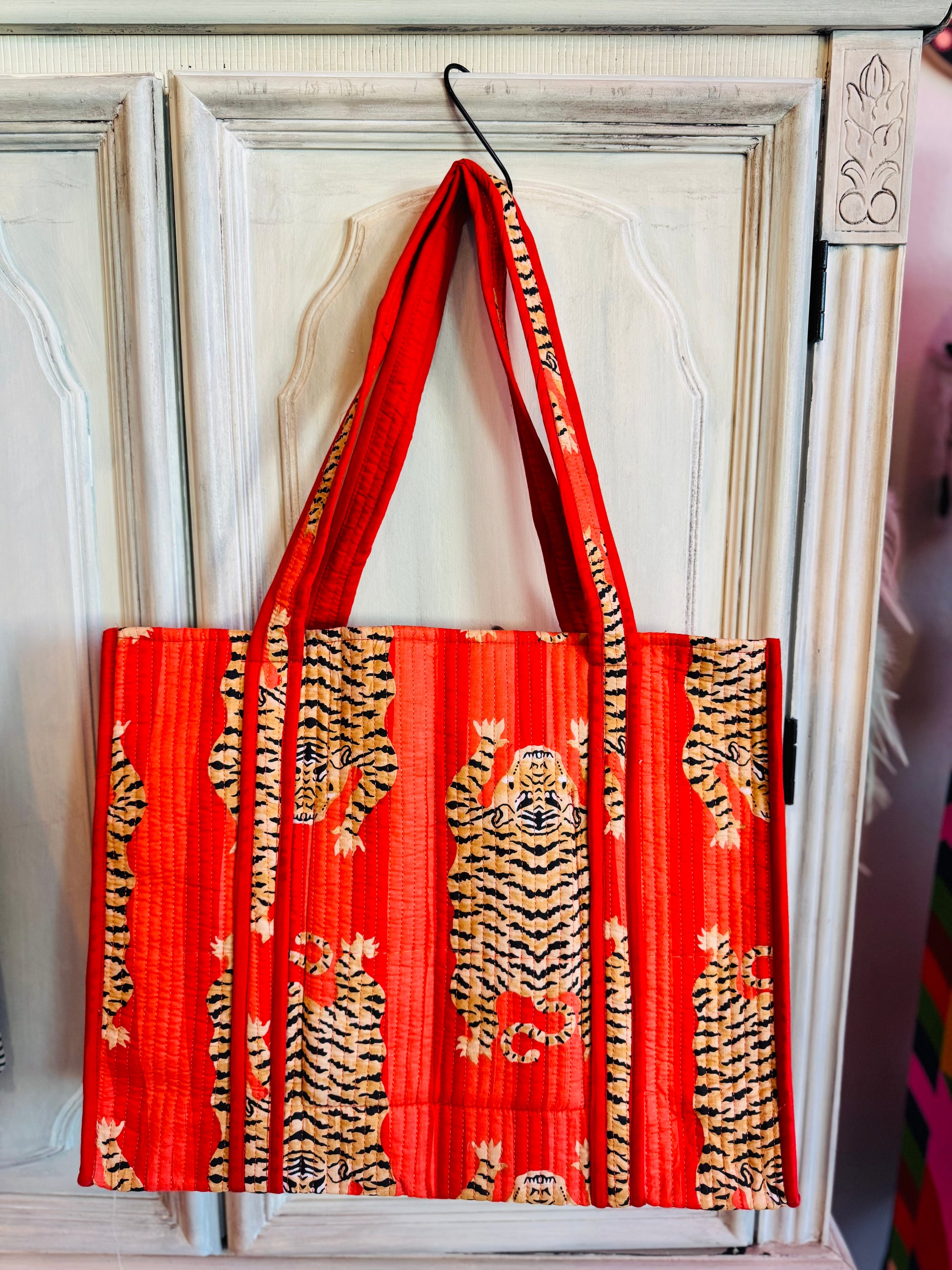 Make a bold statement with the Scarlet Safari Tote. Crafted from vibrant orange hand-block printed cotton with tiger motifs, this quilted tote is both eye-catching and functional — perfect for travel or everyday use.
