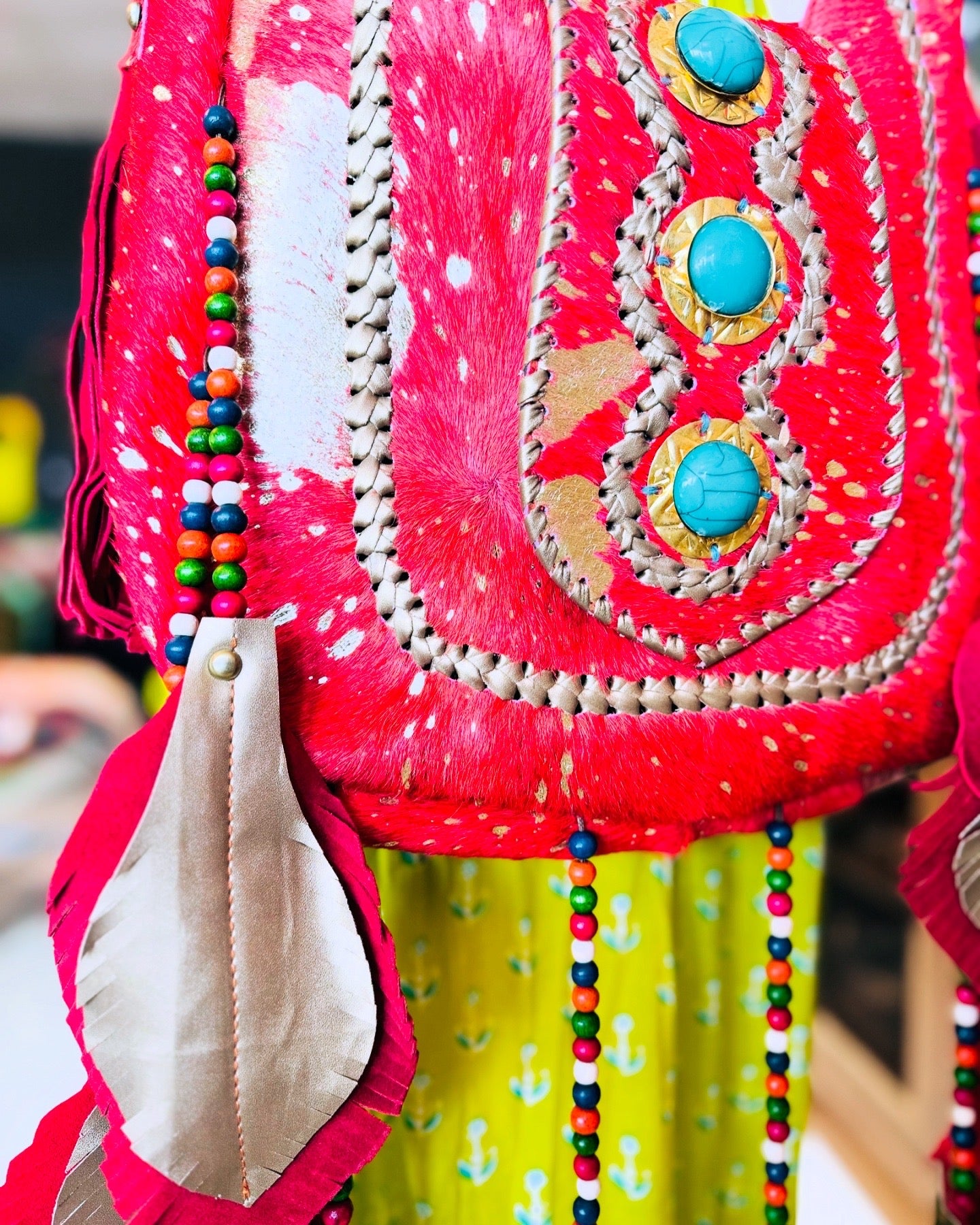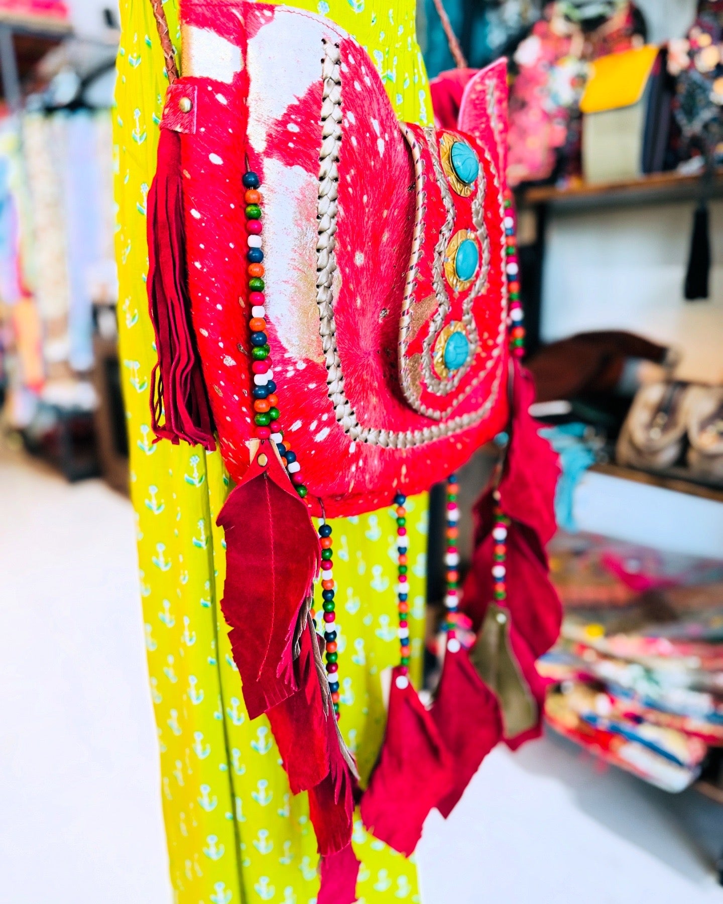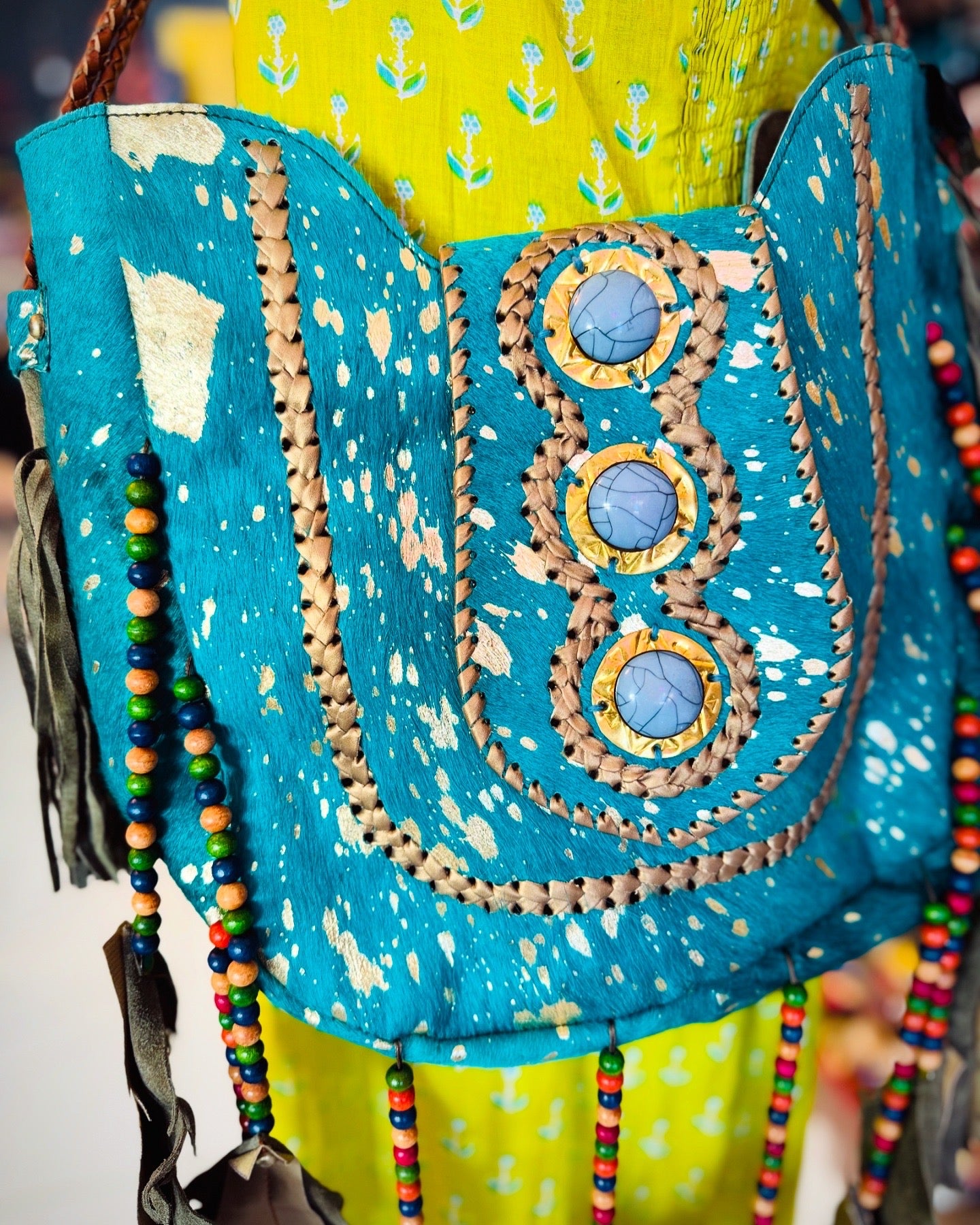 Experience the elegance of our exclusive shoulder bag, crafted from the finest cowhide and leather. Adorned with intricate bead and stone decorations, this bag is a true statement piece. The long flowy accents made of genuine leather and gold accents make the bag shine, adding a touch of luxury to your look. With its long leather strap, it offers both comfort and style. As you walk with this bag, it moves gracefully, making it look like you're dancing with every step.