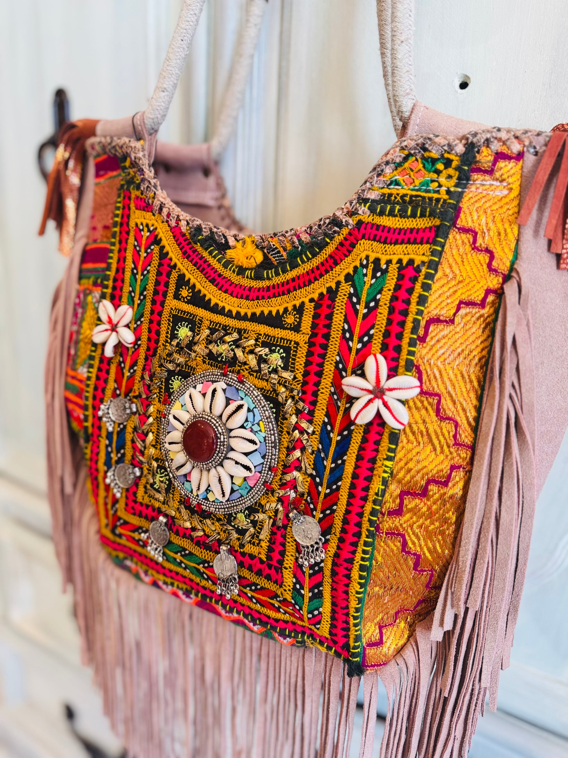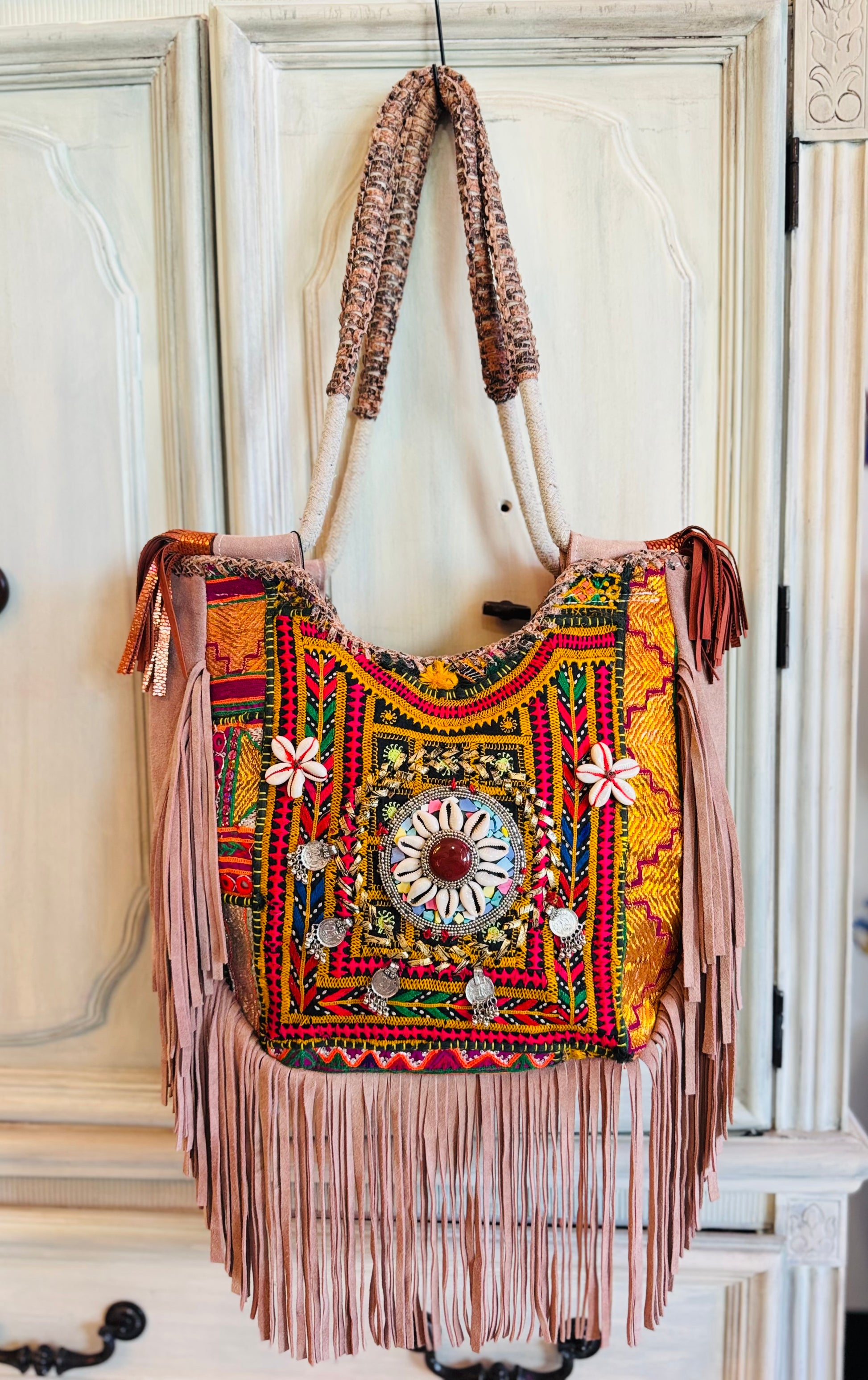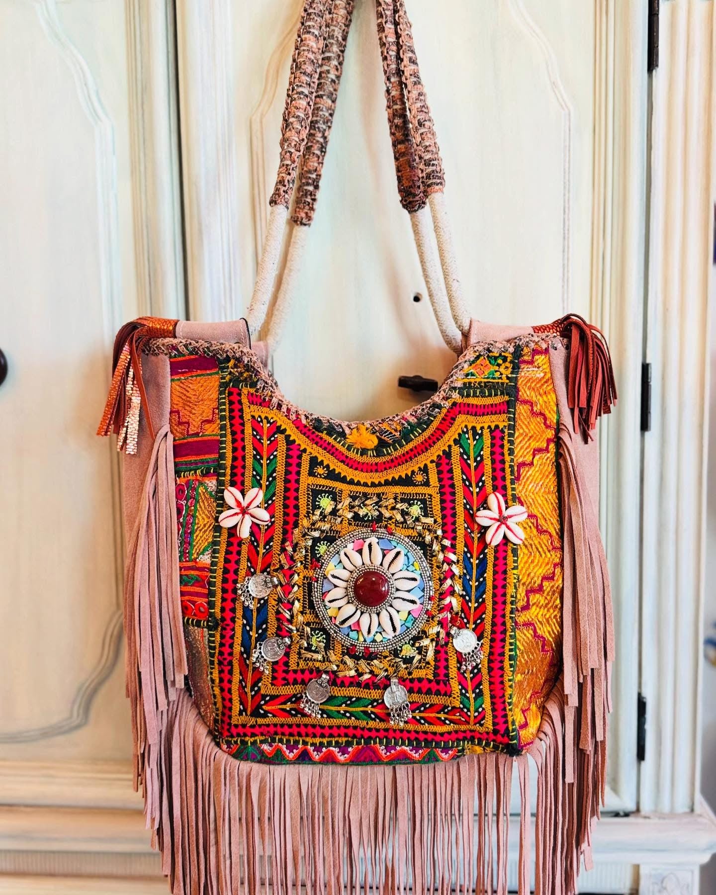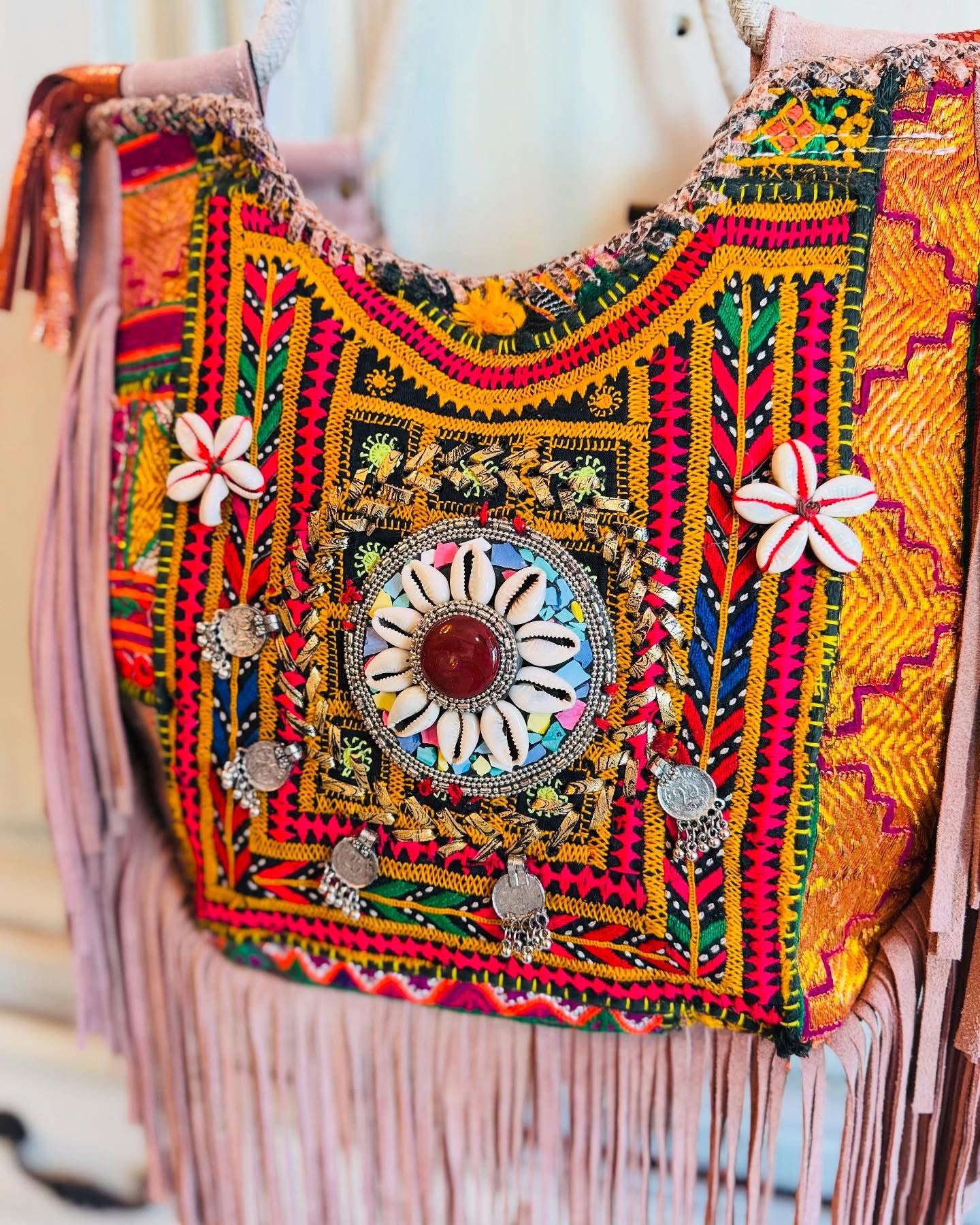 Elevate your style with our handmade shoulder bag crafted from 100% genuine leather and adorned with unique patchwork detailing. Each bag features an exquisite centerpiece decorated with coins, stones, shells, and beads, accessorized with playful tassels for added charm. Hand-embroidered with a blend of fine leather and silk, this bag is a true work of art that combines timeless craftsmanship with modern elegance. Perfect for adding a touch of sophistication to any outfit!