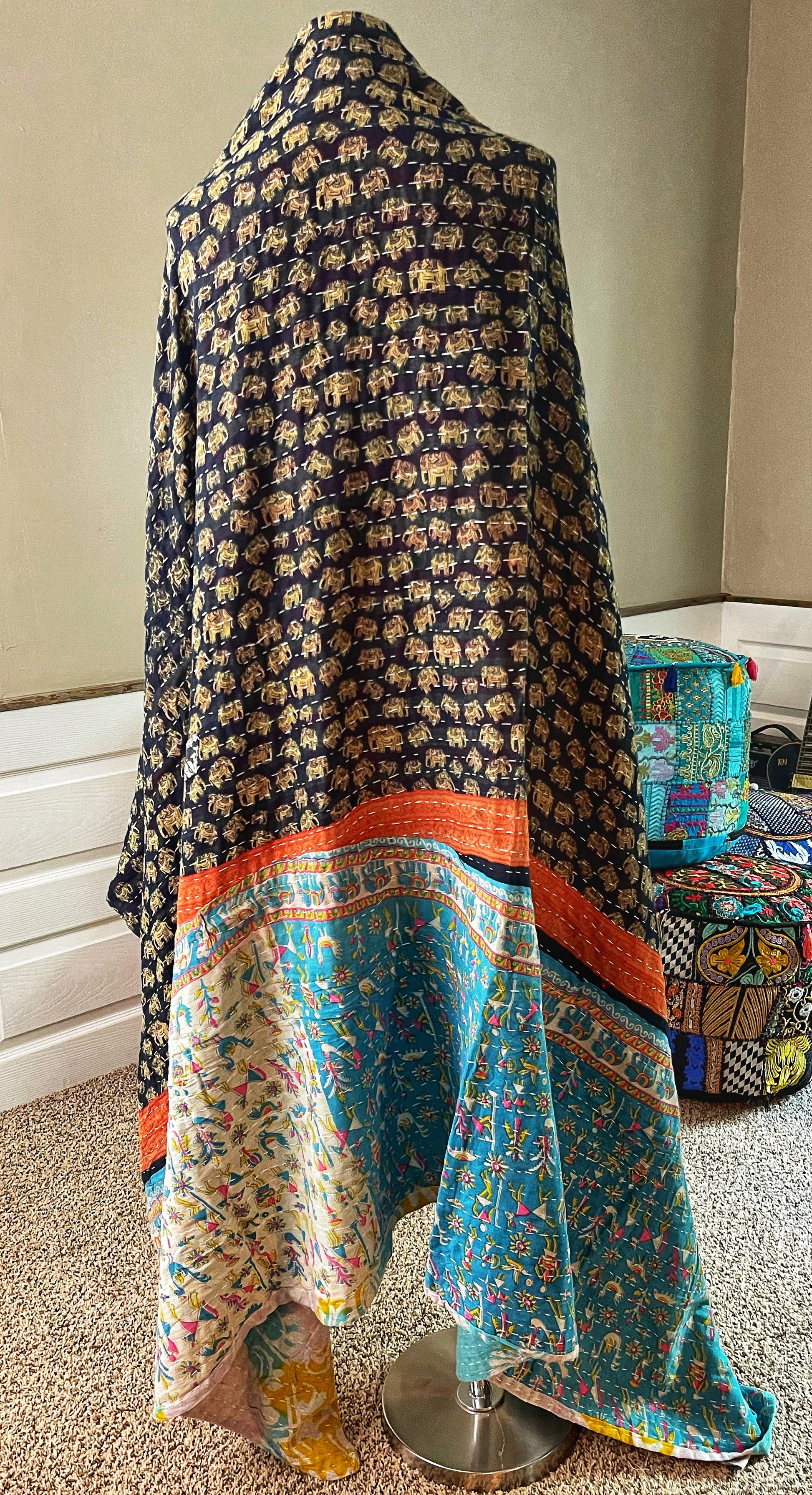 One side of the quilts has Elephants, People, other animals and flowers. Other side is soothing earthy color.