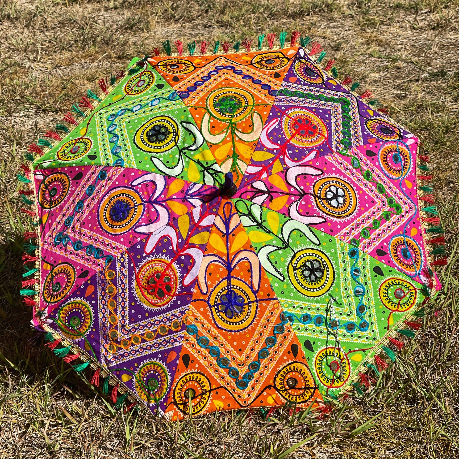 Unique handheld Banjara Sun Parasols. Each parasol is handmade with unique combination of colors and designs. These are Regular size umbrellas (see the Size Comparison picture).