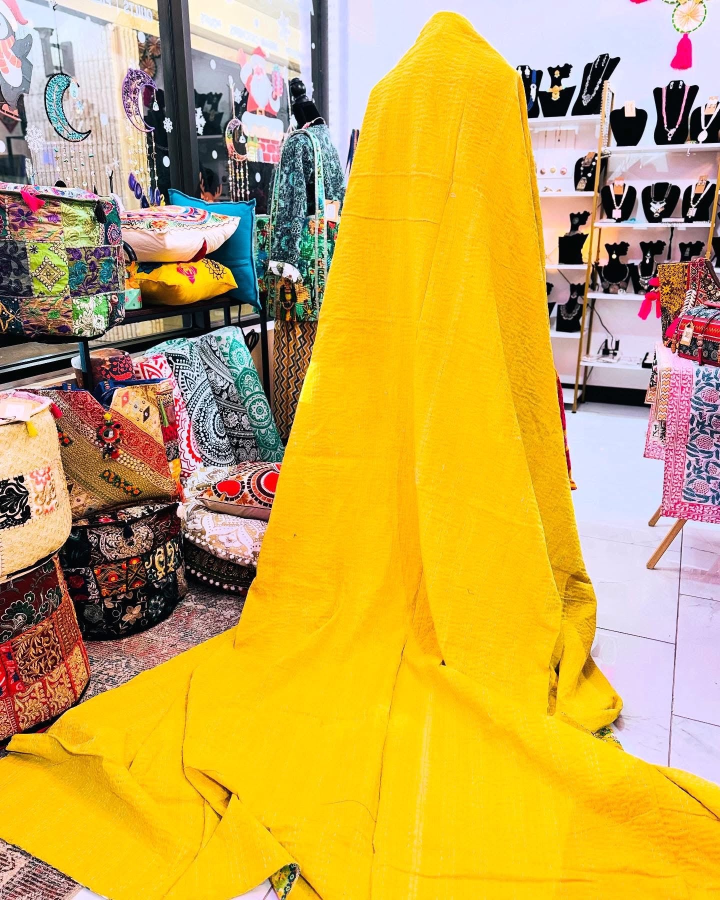Bright and full of heritage charm, Sunlit Paisley brings warmth and elegance into your space. This handblock printed Kantha quilt showcases a timeless mix of paisleys and floral motifs on one side, and a cheerful solid yellow reverse on the other. Lightweight and full of character, it’s an artisan-made treasure perfect for everyday comfort.