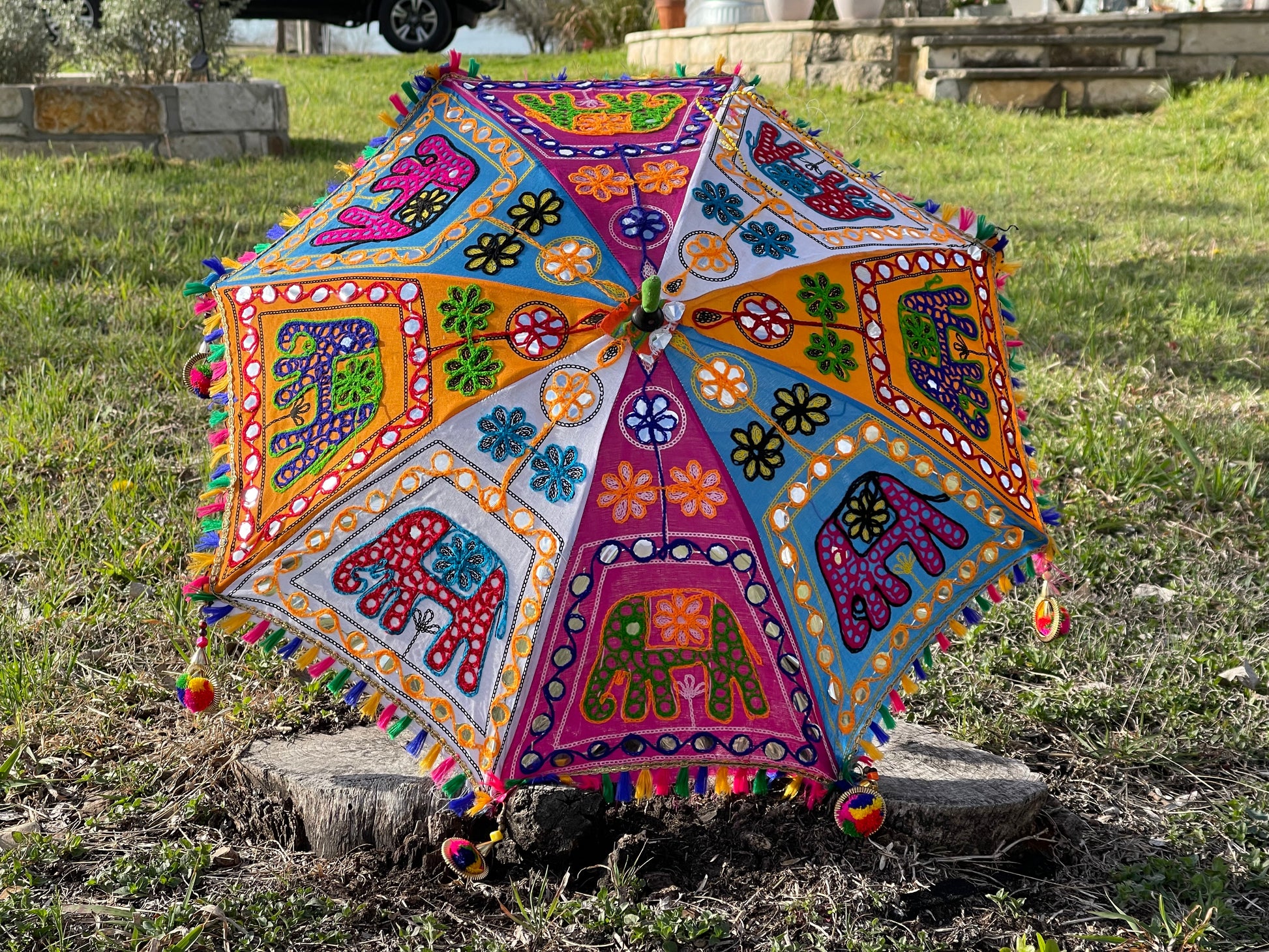 Unique handheld Banjara Sun Parasols. Each parasol is handmade with unique combination of colors and designs. These are Regular size umbrellas (see the Size Comparison picture).
