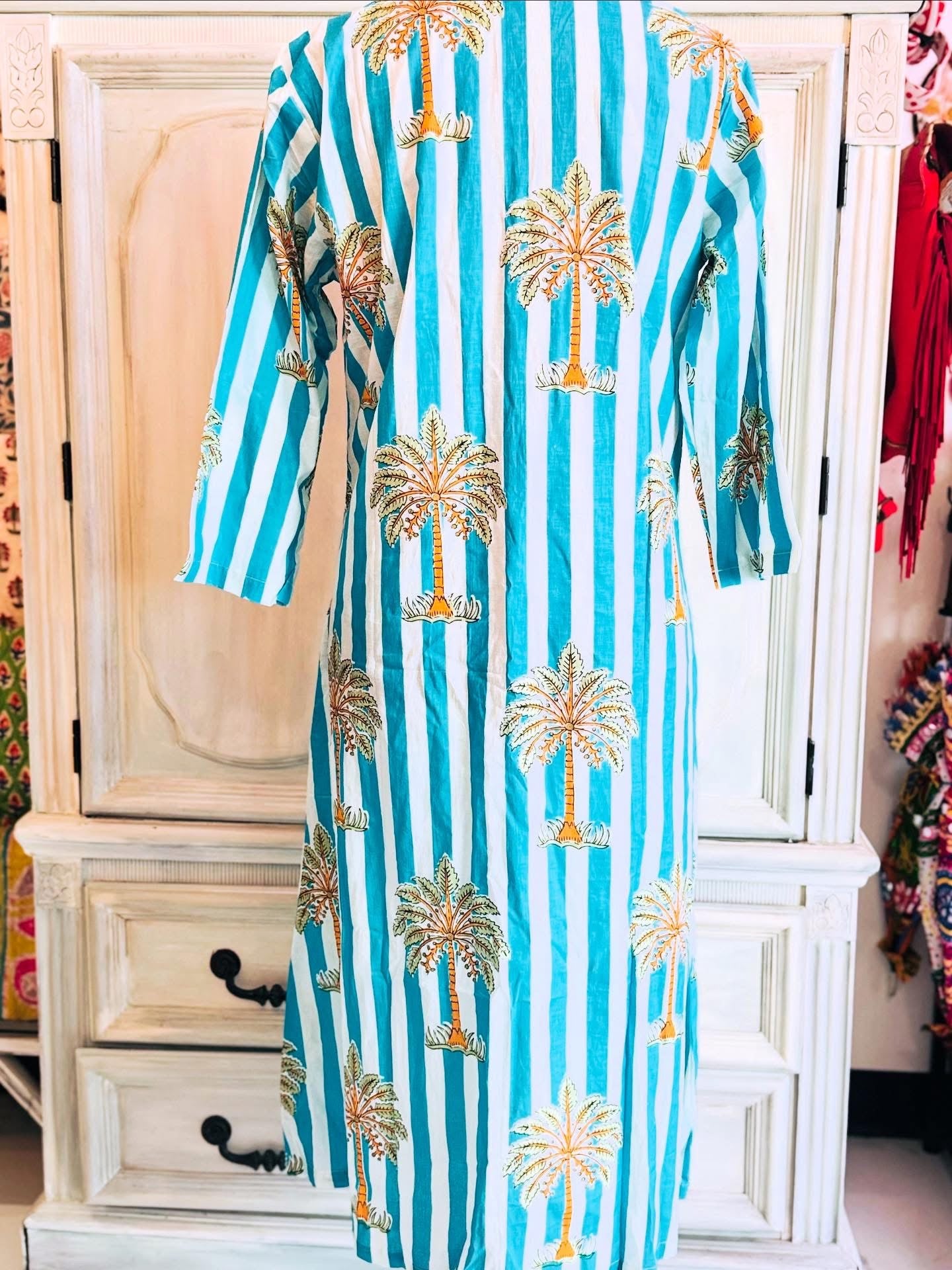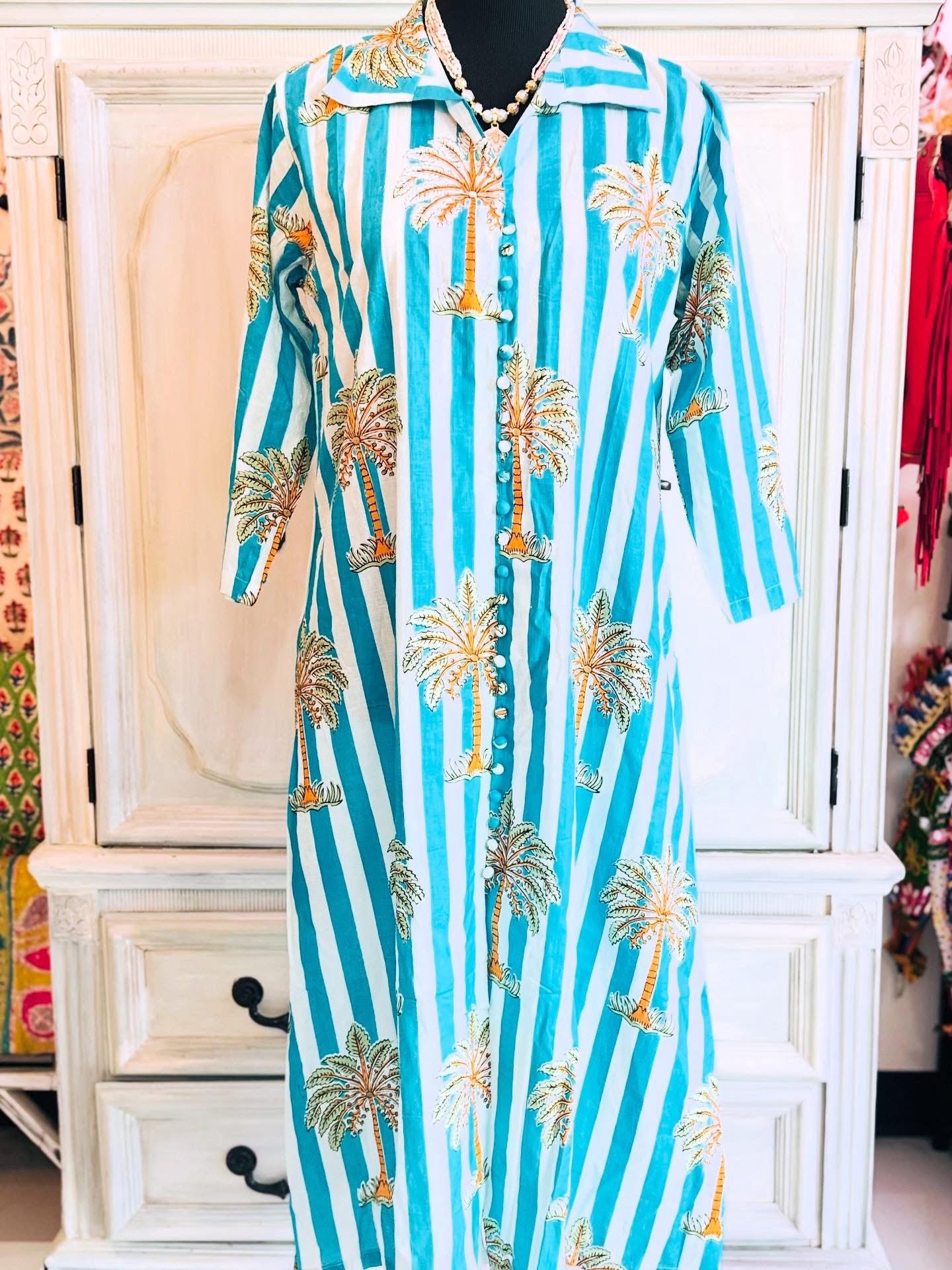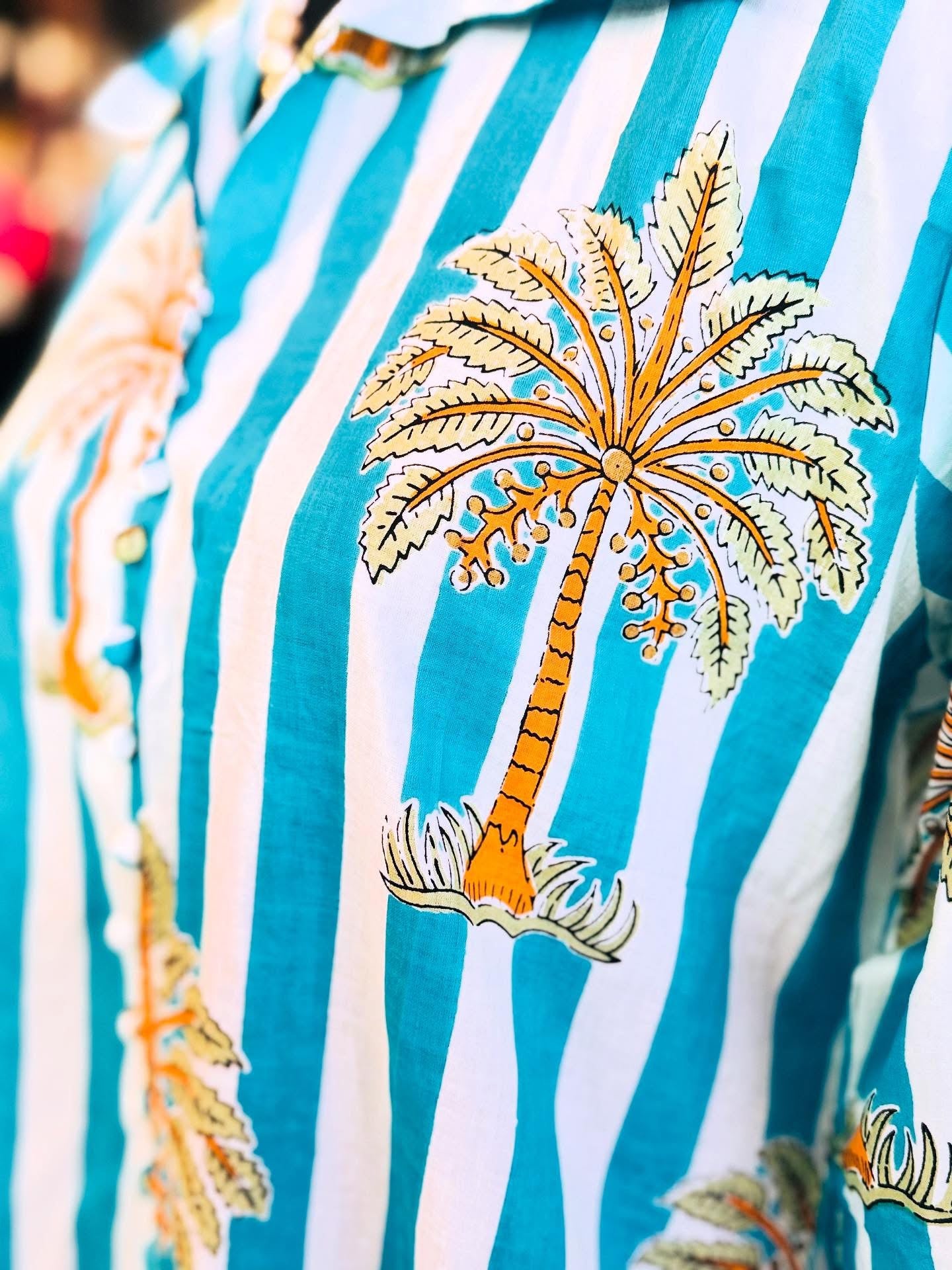 Escape to island dreams with our Tropical Breeze dress. Made from breathable cotton and hand-block printed with palm trees, this button-down beauty brings vacation vibes wherever you go. Vertical turquoise stripes elongate the silhouette while the soft fabric keeps you cool and carefree.