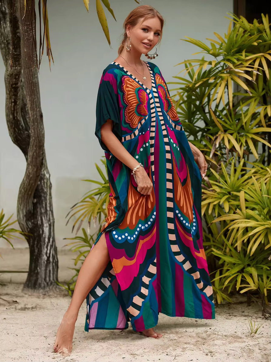The Tropical Butterfly Glow Kaftan brings island-inspired colors to life with its vibrant butterfly motif and beautifully flowing silhouette. This cheerful, lightweight piece adds instant brightness to any day.
